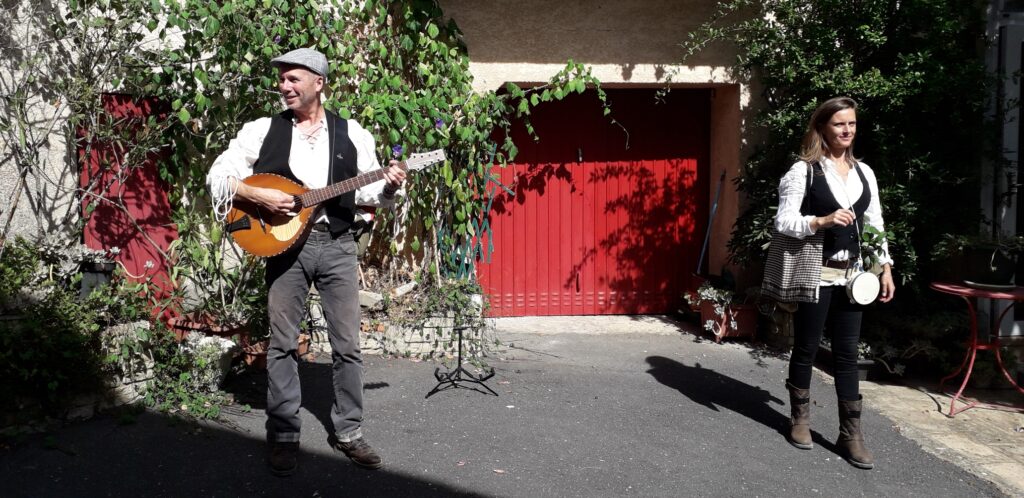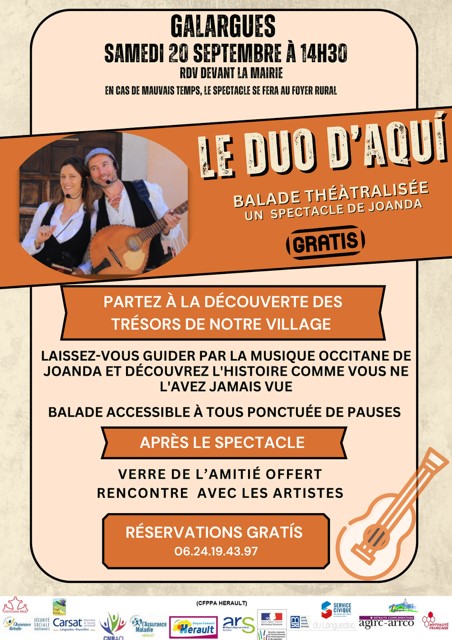 Dissabte 20 de setembre, avem fach una polida passejada teatralizada, entre cançons e scenetas, dins lo vilatge de Galargues, 34160, en companhiá de Joanda (cantaire e musicaire occitan) e de la comediana Valentine Dufloo, per una tantossada ensolelhada.