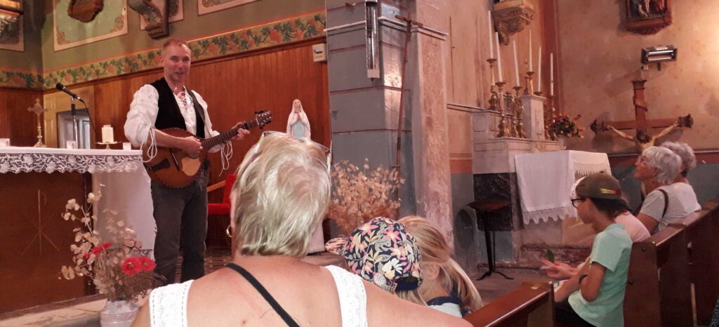 • La glèisa : dins la glèisa, un jòc interactiu de questions/responsas, ambe los del public, qu’avián ja recebut de papièròts, sus la toponimia del vilatge per comprene l’importància de la lenga occitana dins la compreneson  dels noms actuals de  luòcs o de carrièras alentorn de Galargues.